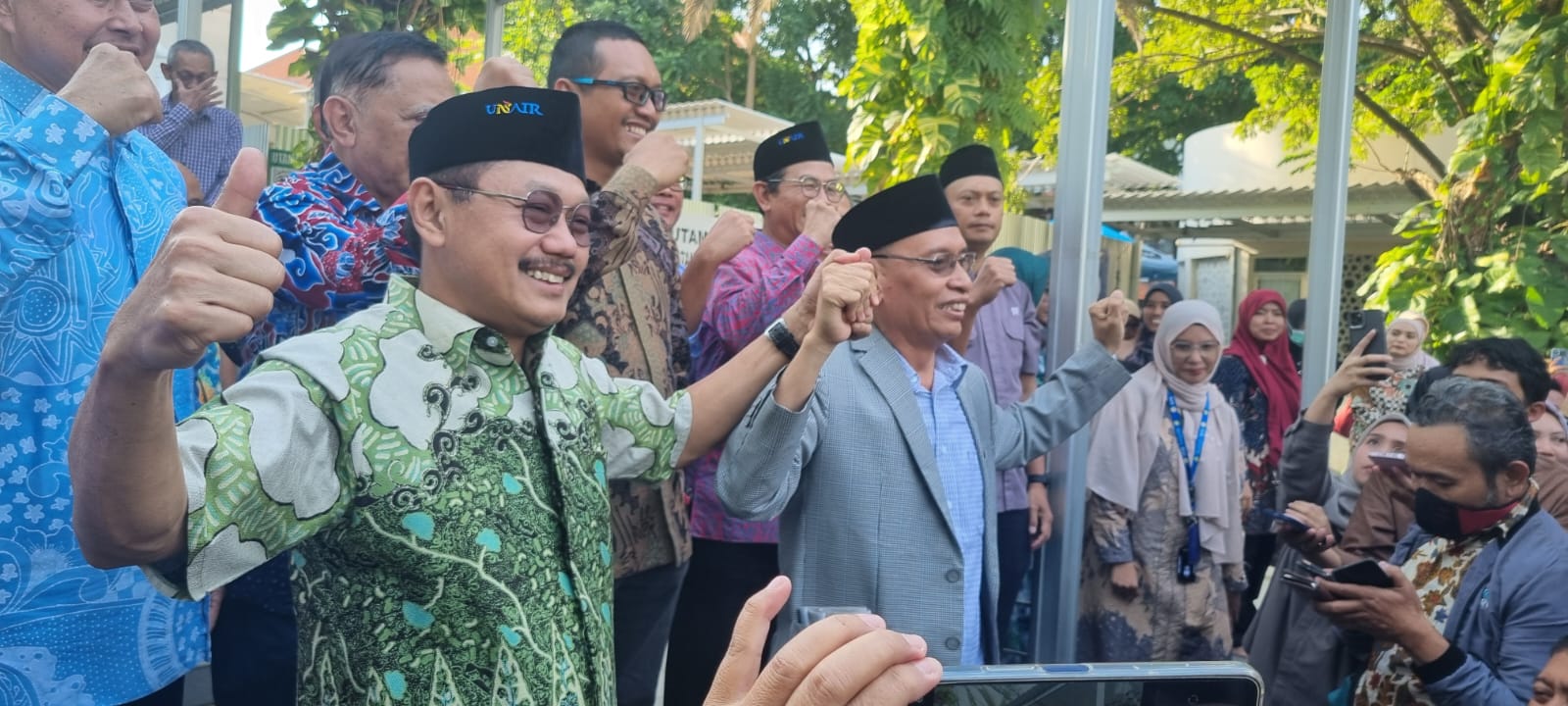 [caption id="attachment_5285" align="alignnone" width="1600"] Rektor Unair Prof Mohammad Nasih (jas abu-abu) bergandengan tangan dengan Prof Budi Santoso. (Insani/Jurnas.net)[/caption]