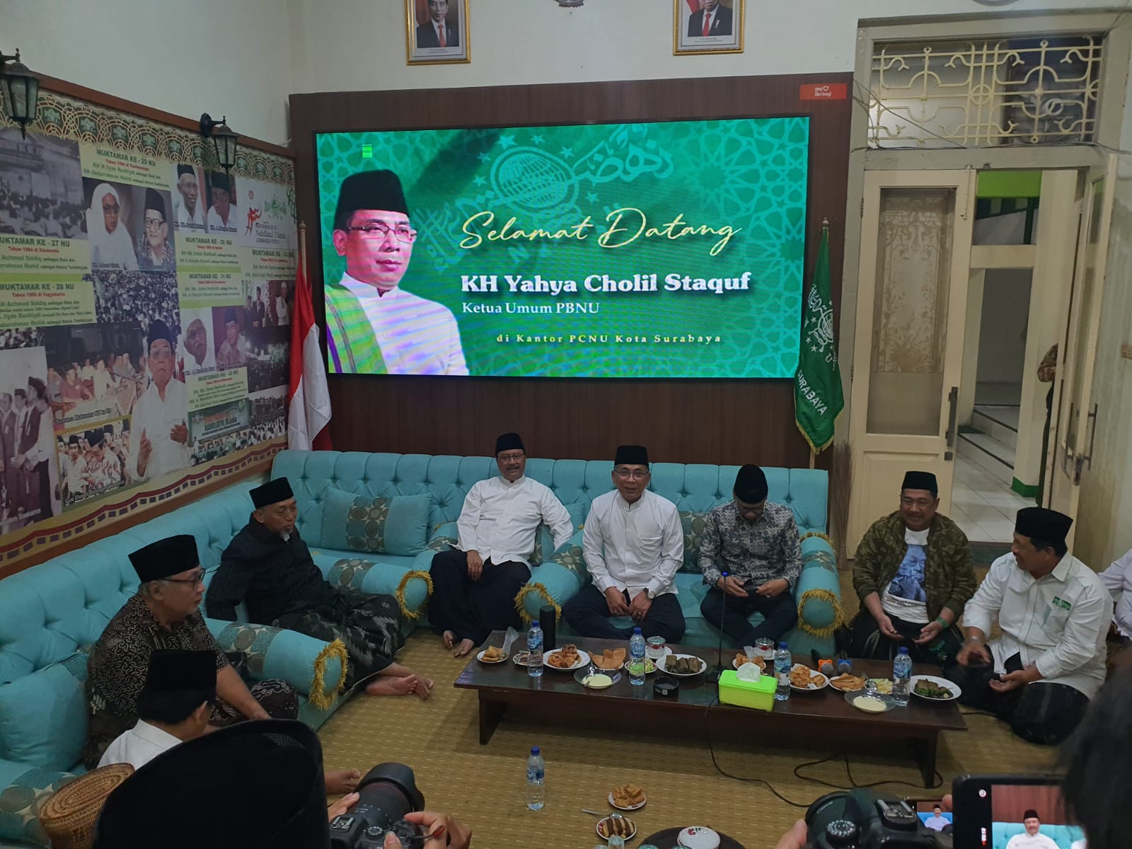 [caption id="attachment_5601" align="alignnone" width="1600"] Ketua Umum Pengurus Besar Nahdlatul Ulama (PBNU), Yahya Cholil Staquf, didampingi Sekjen PBNU Saifullah Yusuf, di kantor PCNU Surabaya. (Insani/Jurnas.net)[/caption]