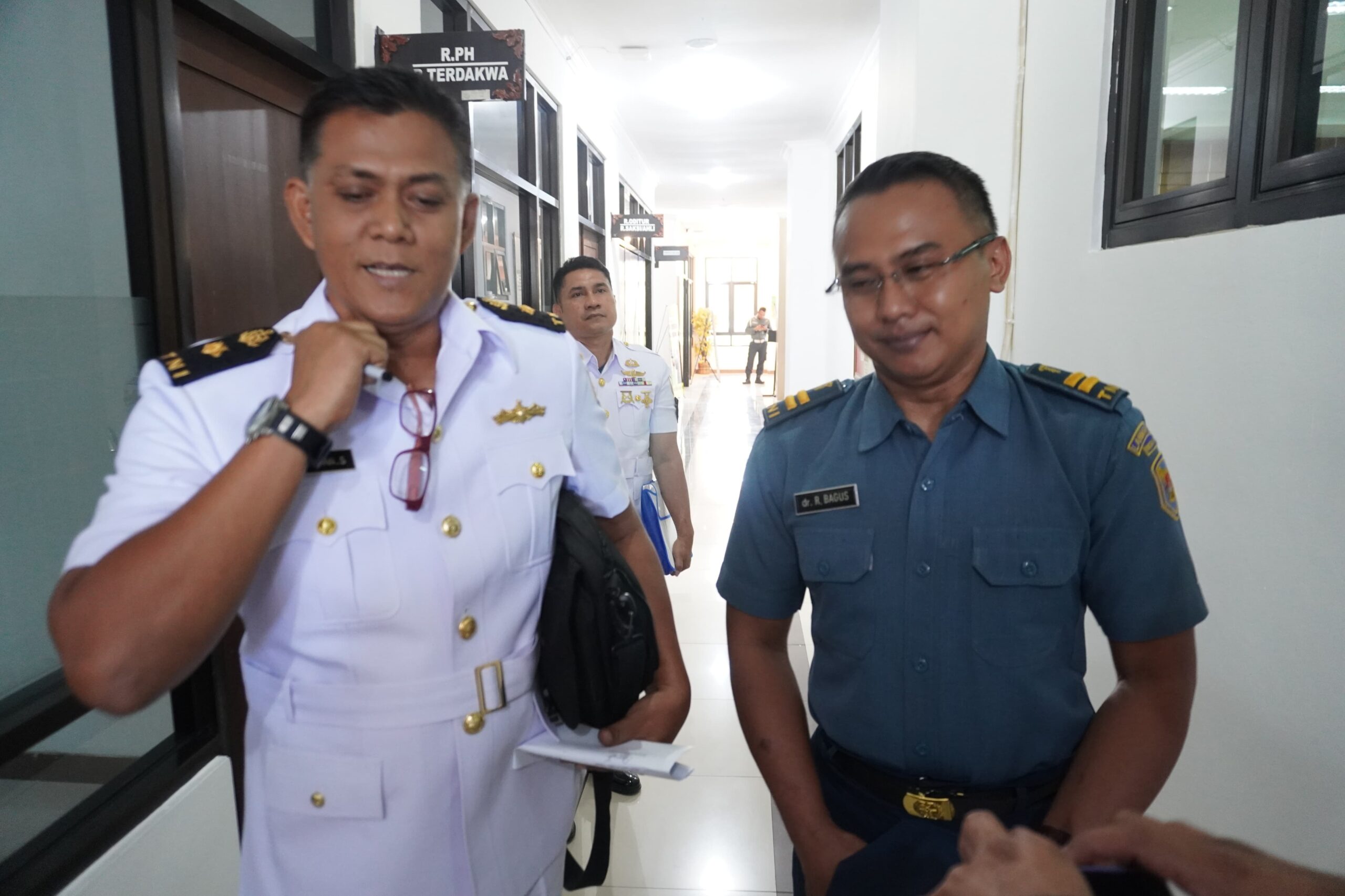 Lettu Laut (K) Dr. Raditya Bagus Kusuma Eka Putra (kaca mata), terdakwa perkara KDRT istri dan anak usai jalani sidang di PN Militer Surabaya. (Insani/Jurnas.net)[/caption]