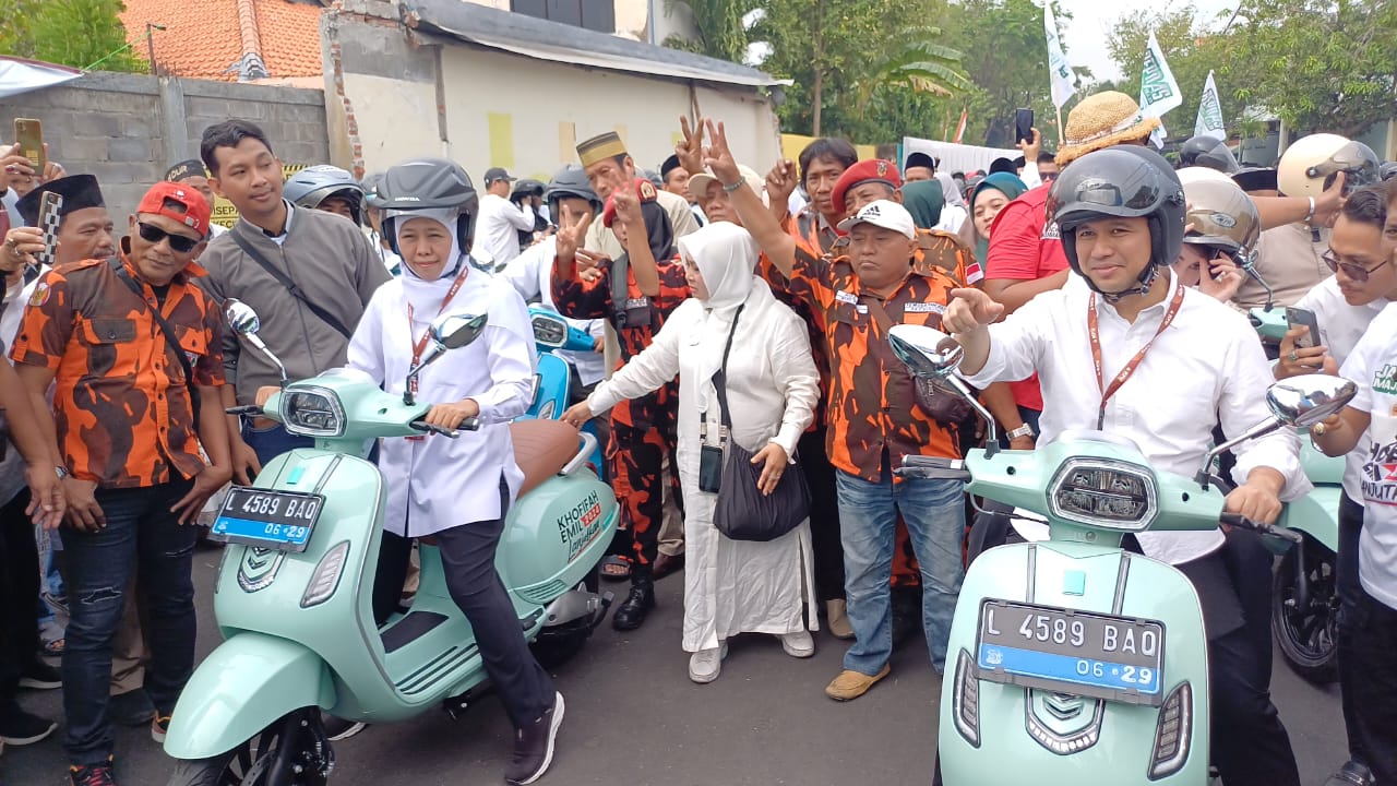 Khofifah Indar Parawansa-Emil Elistianto Dardak menggunakan motor listrik menuju kantor KPU Jatim. (Insani/Jurnas.net)[/caption]