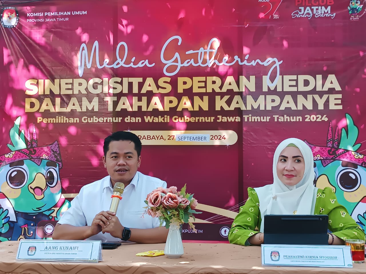 Ketua KPU Jatim, Aang Kunaifi, didampingi Kasubag Parmas KPU Jatim Thiwi. (Insani/Jurnas.net)[/caption]