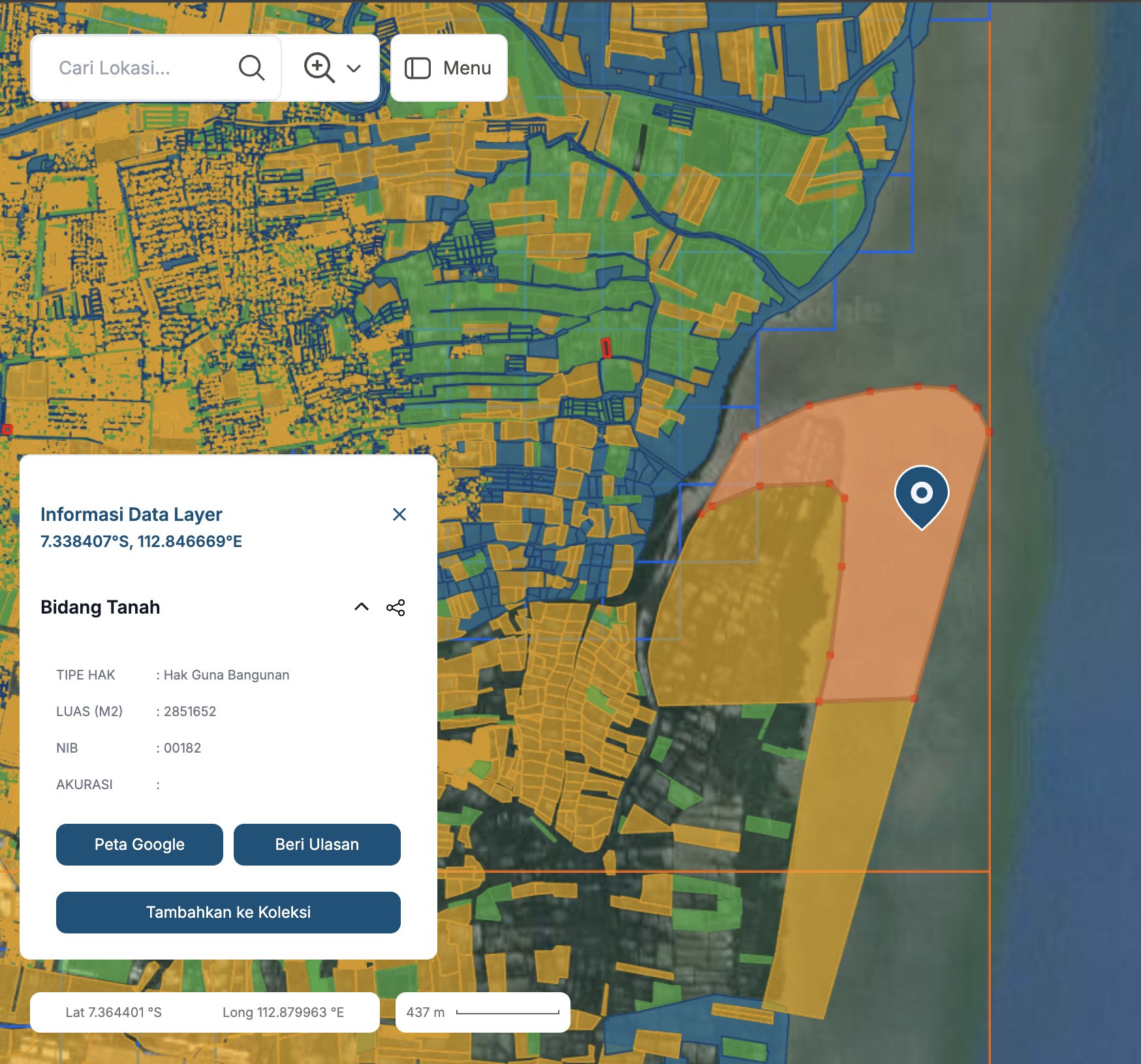 Berdasarkan penelusuran melalui situs bhumi.atrbpn.go.id, terdapat dua bidang tanah yang masing-masing berstatus Hak Guna Bangunan (HGB). HGB pertama mencakup daratan di Kecamatan Sedati, Sidoarjo, hingga ke lautan lepas dengan Nomor Identifikasi Bidang Tanah (NIB) 00182, memiliki luas mencapai 2.851.652 meter persegi.