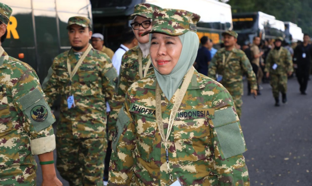 Dalam kegiatan itu, Khofifah sudah tiba di lokasi. Ia tampak mengenakan seragam Komponen Cadangan (Komcad) TNI, yakni pakaian dinas lapangan (PDL) loreng hijau lengkap dengan topi dan sepatu PDL hitam.