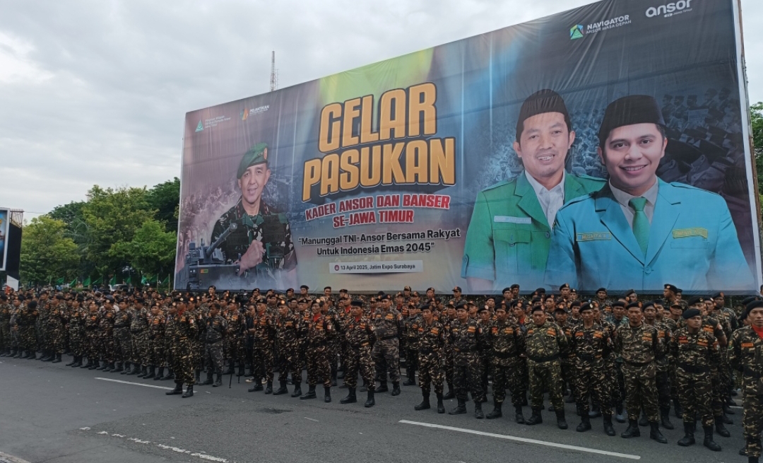 Jurnas.net - Pangdam V/Brawijaya, Mayjen TNI Rudy Saladin, menyampaikan apresiasi atas dukungan Gerakan Pemuda (GP) Ansor terhadap pengesahan Revisi Undang-Undang TNI. Pujian itu disampaikan di hadapan sekitar 20 ribu anggota Ansor dan Banser Jawa Timur dalam acara Gelar Pasukan di Jatim Expo (JX), Surabaya, Minggu, 13 April 2025.