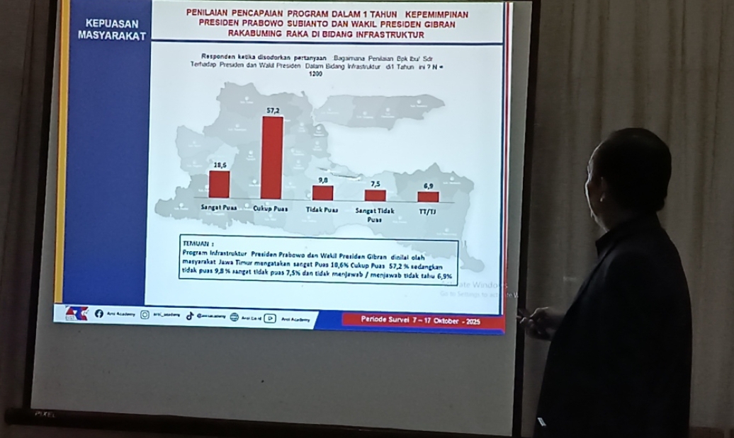 Hal itu terungkap dalam hasil survei Accurate Research and Consulting Indonesia (ARCI) yang dirilis di Surabaya, Selasa, 21 Oktober 2025. Direktur ARCI, Baihaki Sirajt, menyebut sebanyak 82,2 persen warga Jatim menyatakan puas terhadap kinerja Prabowo-Gibran dalam satu tahun masa pemerintahan mereka.