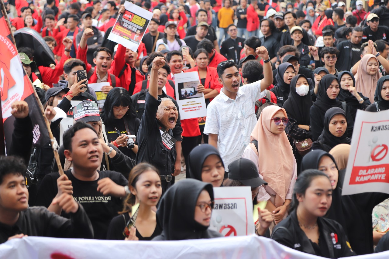 Jurnas.net - Ribuan mahasiswa dari berbagai kampus di Jawa Timur yang tergabung dalam Gerakan Mahasiswa Selamatkan Demokrasi (Gemas’d), menggelar Mimbar Bebas di Kampus Untag Surabaya, Rabu, 6 Desember 2023. Kegiatan itu bertujuan menyuarakan penolakan politik dinasti, yang akhir-akhir ini ramai diperbincangkan.